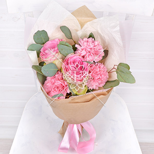 Классические одноголовые розы,  воздушные гвоздики и нежная зелень эвкалипта… соединяясь в волшебном цветочном аккорде, эти цветы выглядят весьма привлекательно!