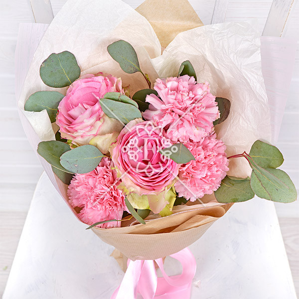 Роза розовая – 2 шт., гвоздика розовая – 3 шт., эвкалипт – 1 шт., упаковка, лента.