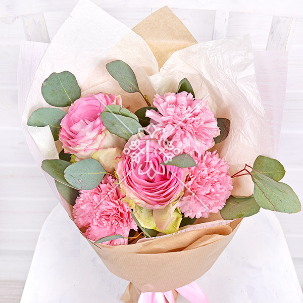 Розовые облака – букет из роз и гвоздик
